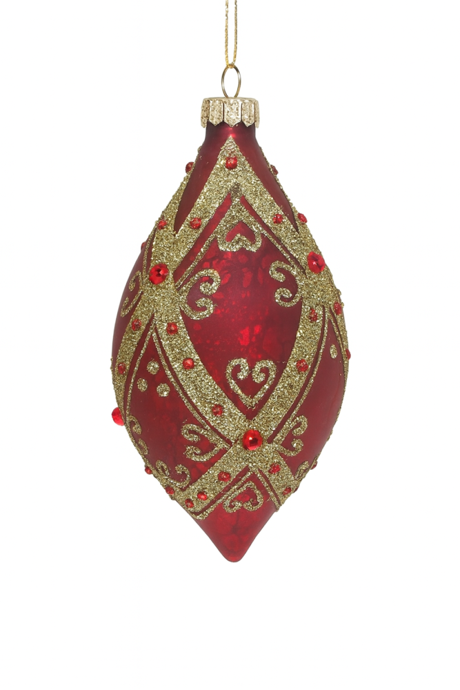 Elegant dråpeformet julekule i dyp rød farge, dekorert med glitrende gullruter og små røde perler. En nydelig kombinasjon som gir et luksuriøst og klassisk preg på juletreet. Perfekt for en tradisjonell og stemningsfull julepynting.