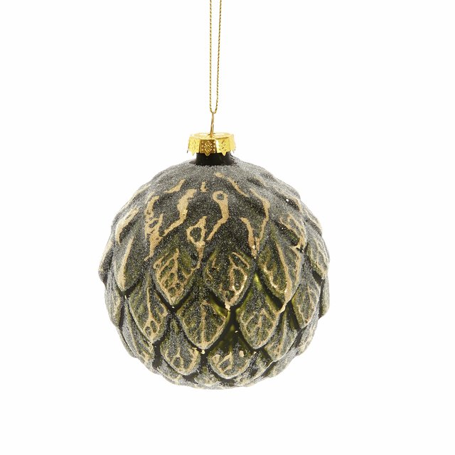 En dekorativ julekule i matt grønn med et unikt, strukturert mønster som gir et eksklusivt og naturinspirert uttrykk. Laget i glass og passer perfekt på juletreet, i vinduet eller som del av en vakker juledekor.