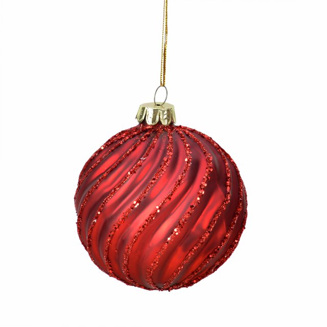 En nydelig rød julekule med elegant, virvlende mønster pyntet med glitrende detaljer. Den matte og blanke kombinasjonen gir en eksklusiv dybde og gjør kulen til et vakkert blikkfang på juletreet eller i juledekorasjoner.