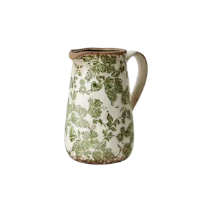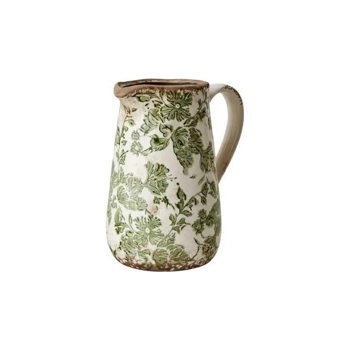 Dekorativ kanne i stengods med vakkert blomsterinspirert mønster i hvitt og grønt. Den klassiske formen og det nostalgiske uttrykket gjør den perfekt både som kanne og som vase til blomster. Et sjarmerende innslag på bordet, kjøkkenbenken eller i en hylle.