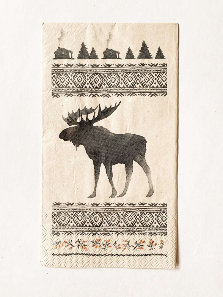 Dekorativ serviett med flott elgmotiv og tradisjonelle mønsterdetaljer – perfekt til hytta, jaktlaget eller for deg som elsker natur og nordisk stil. Skaper en lun og stemningsfull borddekking.