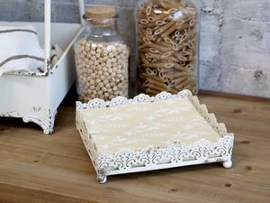 Elegant og dekorativ serviettholder i antikk kremfarget metall med utskåret mønster og små føtter som gir den et løftet og lett uttrykk. Den slitte finishen gir en nostalgisk og rustikk følelse – perfekt til et romantisk eller landlig interiør.